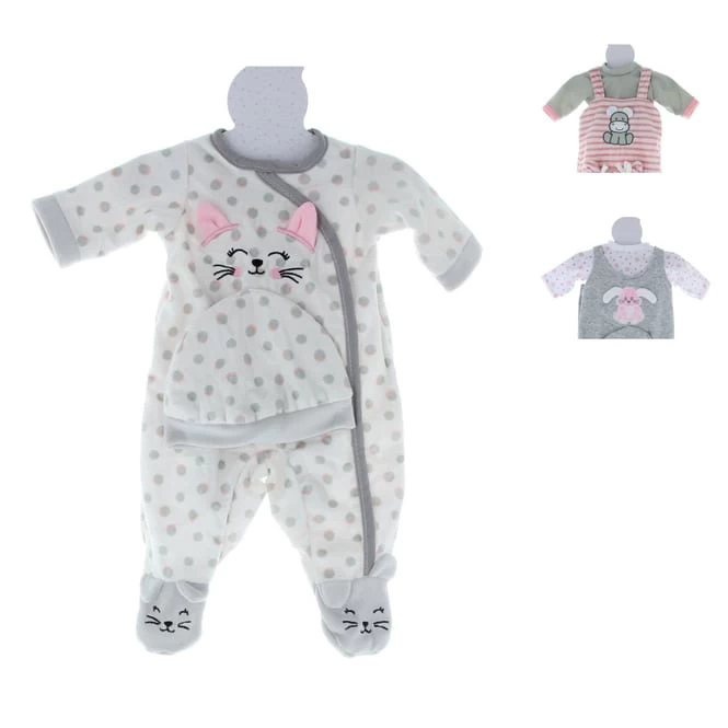 - Strampelanzug in grau mit Hasen-Motiv, Shirt in weiß mit rosa Sternen und grauen Punkten, Mütze
