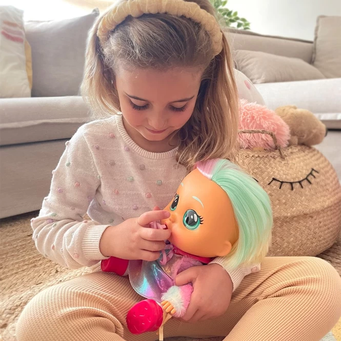 Das Cry Baby Dressy Fantasy Hannah ist ein ganz außergewöhnliches Baby. Im detailgetreuen Hannah-Look der beliebten, animierten Cry Babies Serie auf kitoons und YouTube bezaubert es jetzt auch als echte Spielpuppe. Ihre glänzenden, regenbogenfarbenen Haare und ihr stylishes Outfit, bestehend aus einem schillernden Kleidchen mit flauschigem Jäckchen und passenden pinken Schuhen, sind einfach zuckersüß! Wenn man ihren Schnuller wegnimmt, weint sie große Kullertränen und macht weinerliche Geräusche. Gibt man ihn ihr zurück, beruhigt sie sich im Handumdrehen. Für mehr Abwechslung können Kleidung und Schuhe einfach ausgezogen und getauscht werden. Außerdem sind die Arme und Beine flexibel beweglich und auch das Gewicht dieses neuen Cry Babys ist reduzierter, das Köpfchen softer und die Augen strahlen noch realistischer. Ob für zuhause oder unterwegs – die niedliche, 30 cm große Puppe Hannah ist mit ihrem fixierten Schnullerband stets für alle Ausflüge gewappnet.