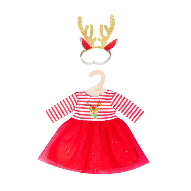Vorhang auf für Rentier Rudi! Das Weihnachtspuppenkleid „Rentier Rudi“ von Heless mit Haarband sorgt für allerbeste Laune. Das fröhliche weiß-rot geringelte Oberteil mit Rentier-Print ist ein schöner Kontrast zum edlen roten Tüllrock, der mit Glitzerpünktchen tolle Akzente setzt. Ein roter Unterrock lässt das Kleid perfekt fallen. Abgerundet wird das Outfit durch das Rentier-Haarband mit prachtvollem, goldenen Geweih, das dank seines elastischen Bands auf jedes Puppenköpfchen passt. Nicht nur zur Weihnachtszeit, auch zu allen anderen festlichen Anlässen ist dieses hübsche Puppenoutfit ein absoluter Hingucker. Das Kleid passt den meisten marktgängigen Puppen der Größe 35-45 cm.