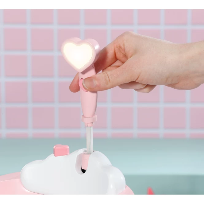 Juhu, Badezeit. Baby Annabell macht es sich in der zauberhaften Wanne bequem und kann nun ganz ohne Wasser baden. Durch Drücken des pinken Schalters auf der Wolke, steigt der imaginäre Wasserpegel in den durchsichtigen Scheiben an. Wasserpflanzen, Meeresgetier und Unterwasserwesen kommen zum Vorschein.Tippt man den herzigen Knopf auf der Brause kurz an, hört man Wasser vor sich hinplätschern. Wird selbiger gedrückt gehalten, leuchtet das Herz im Duschkopf und erzeugt durch den Lichtstrahl die Illusion eines Wasserstrahls. Mit dem kann Baby Annabell dann spielerisch abgeduscht werden. Der einzigartige Badespaß wird begleitet von allerhand Wassergeräuschen.