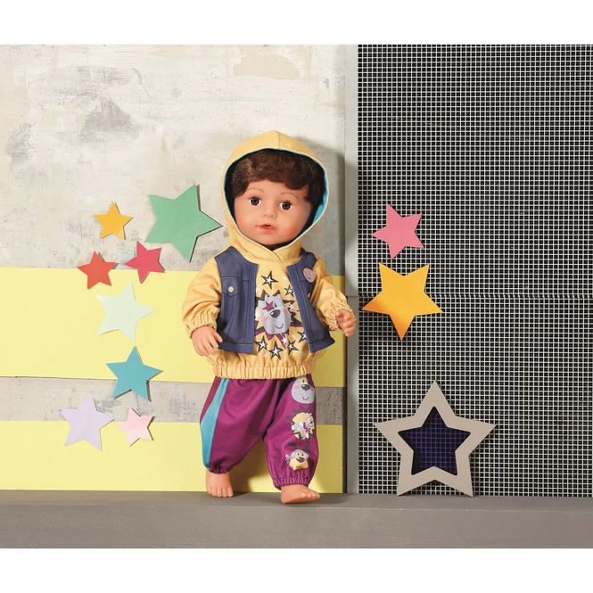 BABY borns Streetwear besteht aus einem gelben Hoody und einer lässigen Jogginghose. Das Kapuzenoberteil ist ein 2-in-1 mit angenähter Weste in Jeansoptik.
