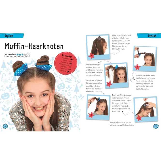 Dieses Buch macht Schluss mit Haare raufen – Mithilfe der Aufteilung in die Kapitel „Im Alltag“, „In der Schule“, „Festlich“ und „Stylish“ und den Schwierigkeitsangaben findet ihr schnell die passende Frisur und der Stylingspaß kann losgehen!